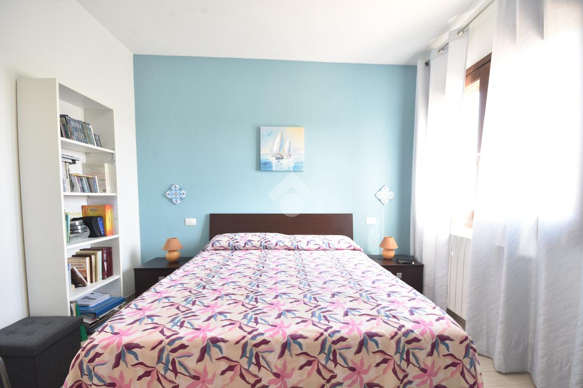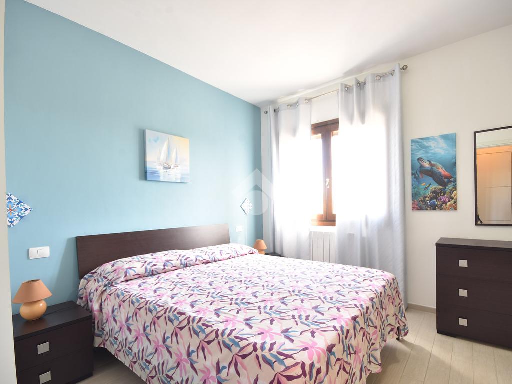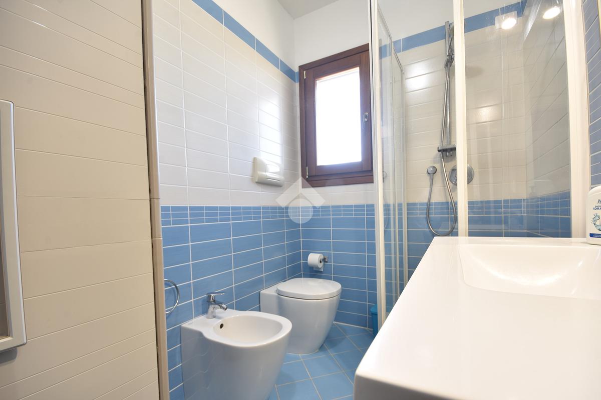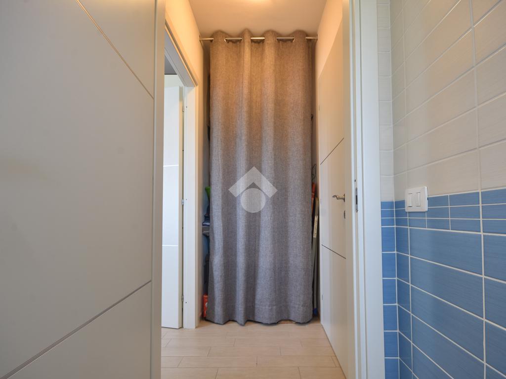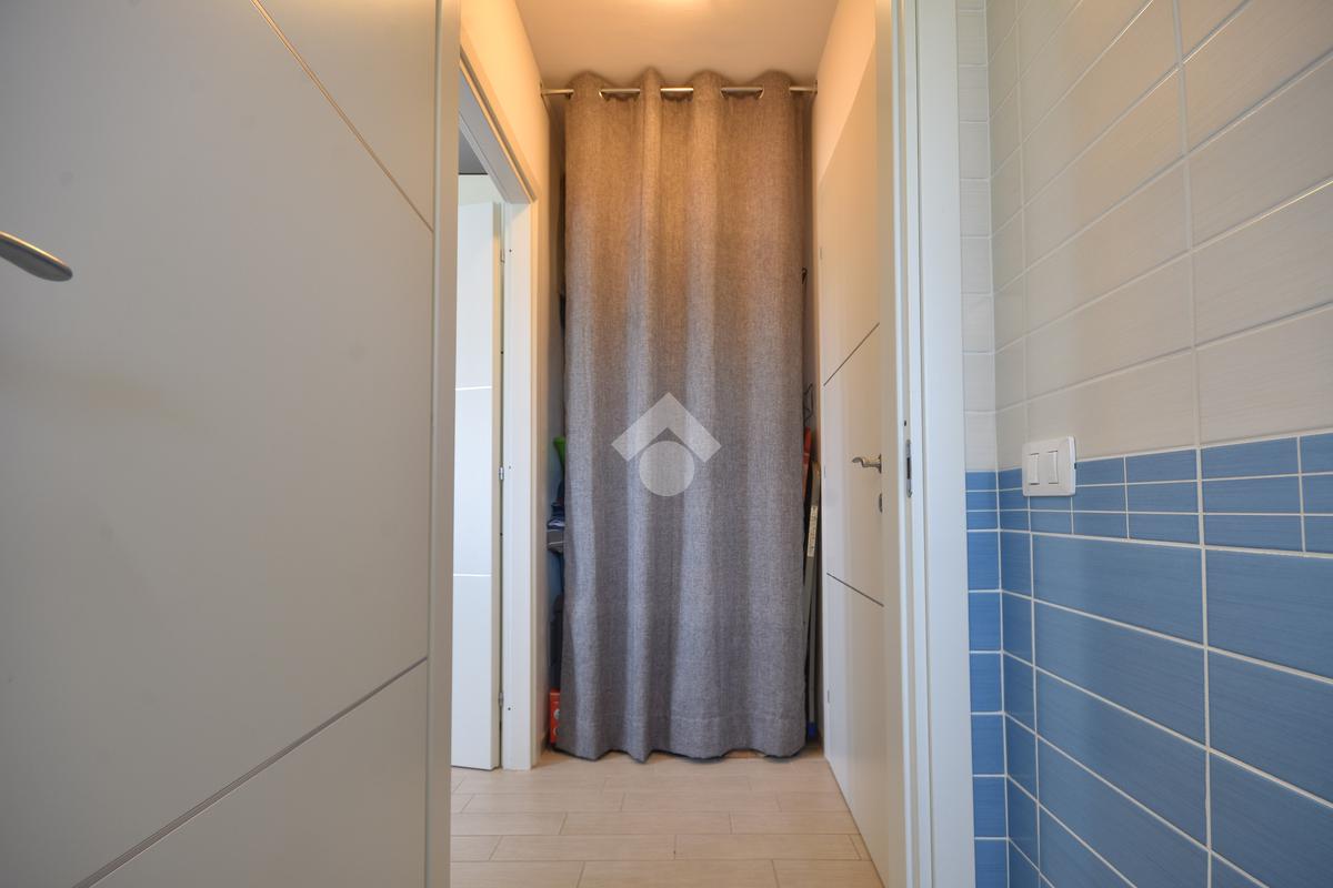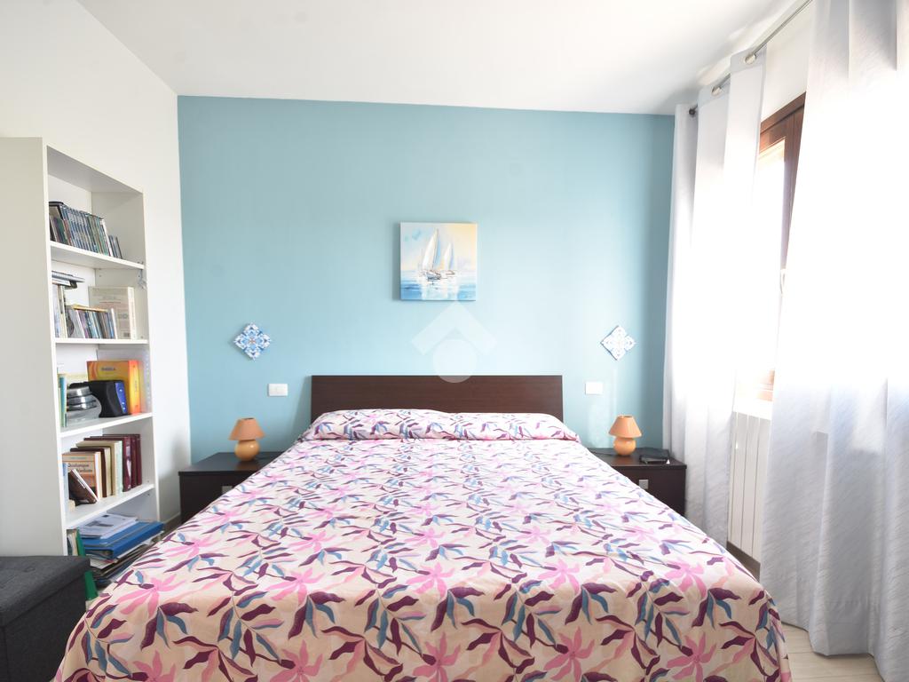 Un comodo disimpegno, dotato di pratico ripostiglio, accompagna alla camera da letto matrimoniale, ampia e luminosa, e al bagno finestrato con doccia, rifinito con eleganti piastrelle azzurre.