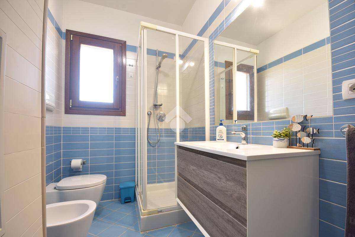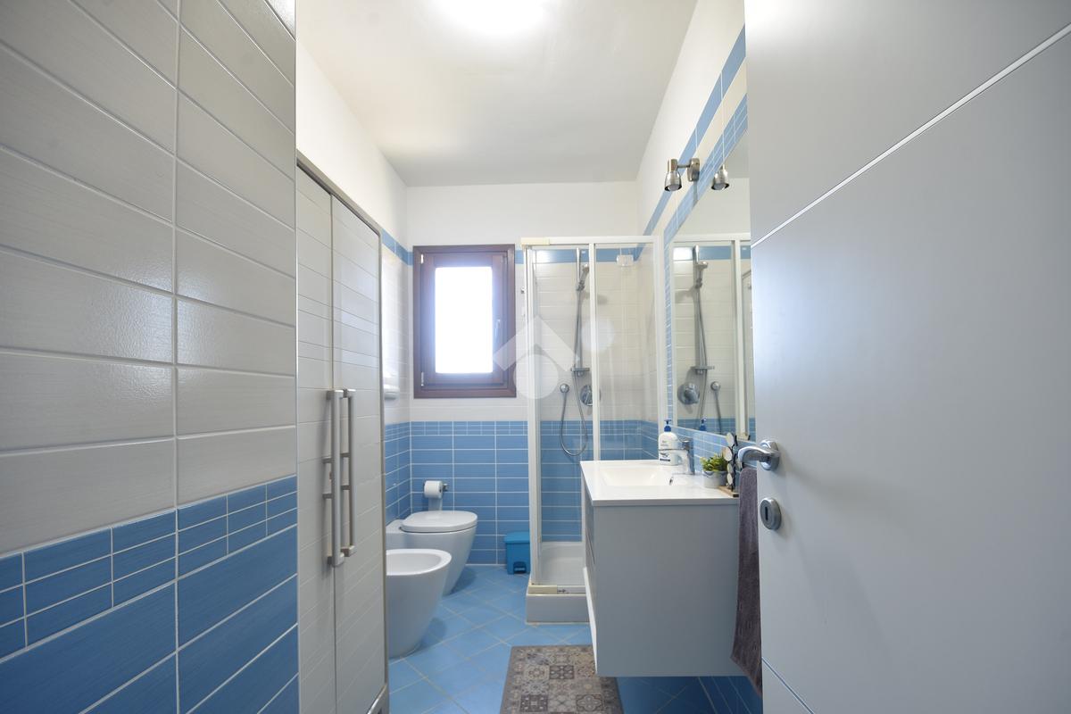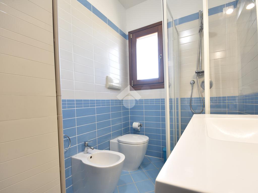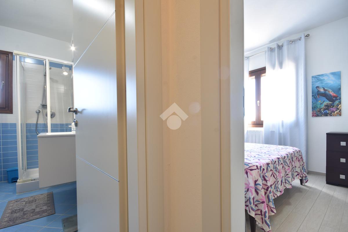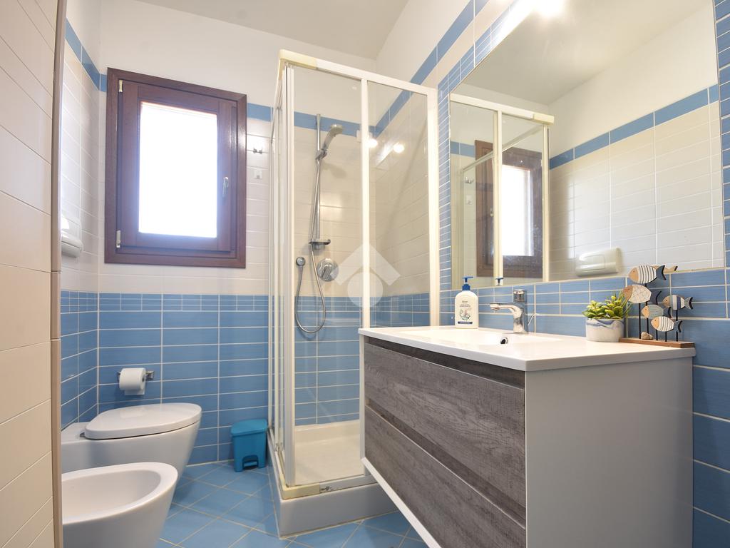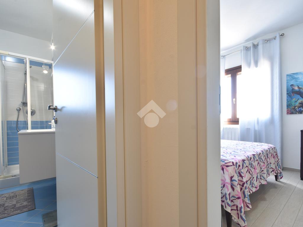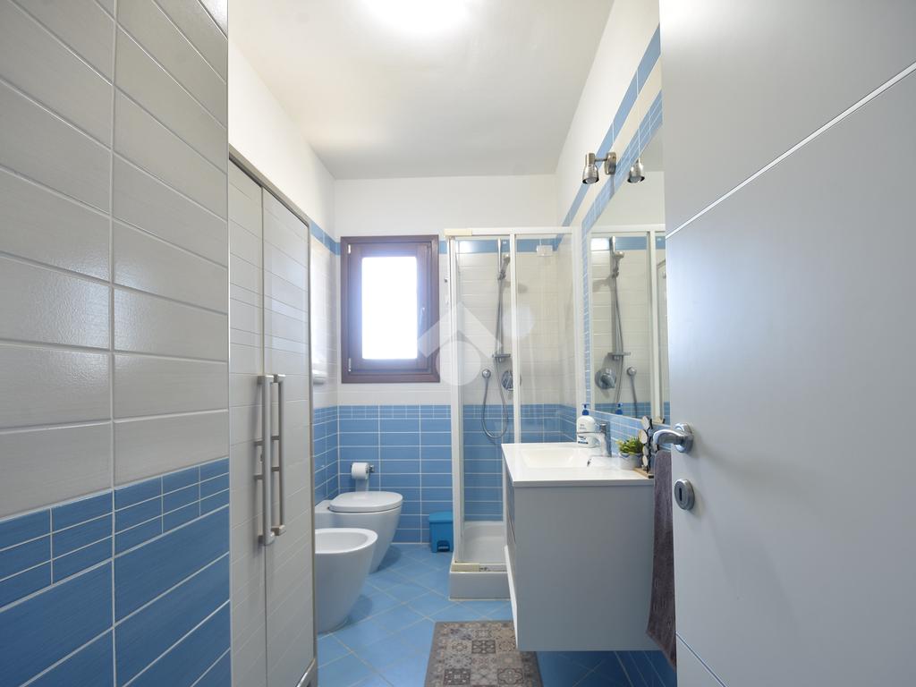 Un comodo disimpegno, dotato di pratico ripostiglio, accompagna alla camera da letto matrimoniale, ampia e luminosa, e al bagno finestrato con doccia, rifinito con eleganti piastrelle azzurre.